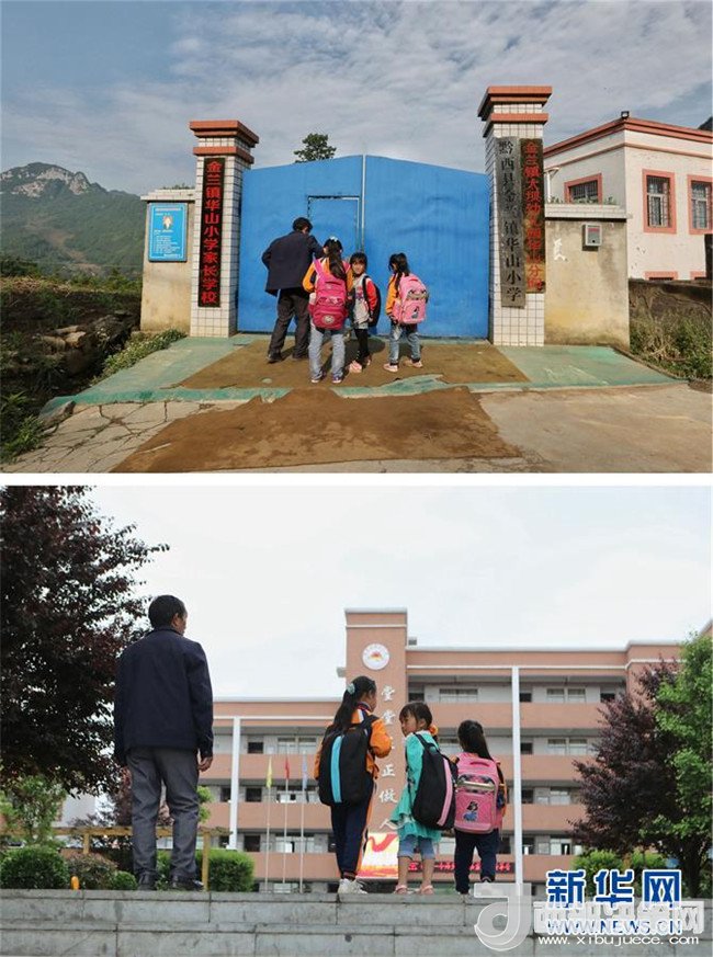 拼版照片:上圖為教師楊紹書和學(xué)生們經(jīng)過約2個小時的艱難跋涉到達(dá)華山小學(xué)(4月27日攝);下圖為教師楊紹書和學(xué)生們經(jīng)過20多分鐘的公路行走,到達(dá)黔西縣第十小學(xué)(5月7日攝)。