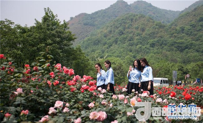 來自成都的大學生在位于四川綿竹市的“中國玫瑰谷”游覽拍照(4月18日攝)。新華社記者 張帆 攝
