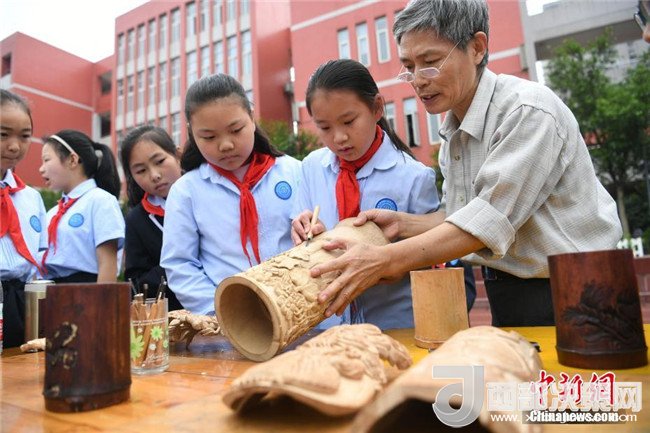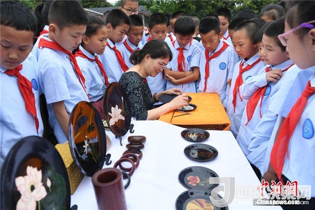 活動(dòng)現(xiàn)場,15個(gè)國家級和市級非物質(zhì)文化遺產(chǎn)項(xiàng)目為重慶沙坪壩西永第一小學(xué)校的師生帶來一場豐盛文化遺產(chǎn)大餐,讓師生們近距離感受了中華優(yōu)秀傳統(tǒng)文化的魅力。圖為活動(dòng)現(xiàn)場學(xué)生們參觀非物質(zhì)文化遺產(chǎn)項(xiàng)目。 陳超 攝