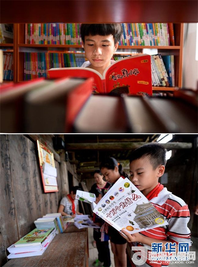 這是一張拼版圖片。上圖為2018年5月30日,在廣西三江侗族自治縣洋溪鄉(xiāng)中學(xué),15歲的秦仁金在圖書館里看書;下圖為2014年6月10日,秦仁金在吊腳樓教室閱讀愛心人士送來的書本。