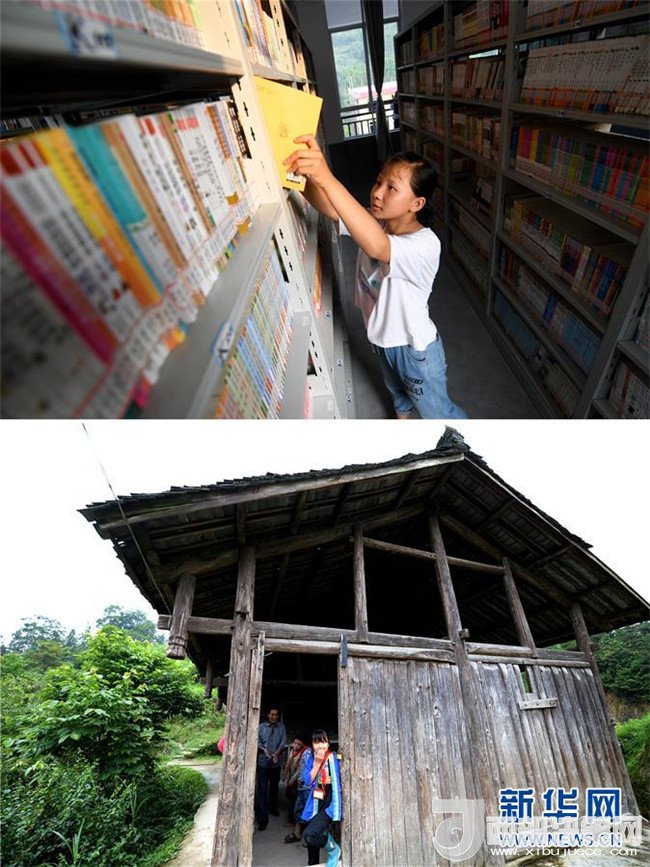 這是一張拼版圖片。上圖為2018年5月30日,在廣西三江侗族自治縣洋溪鄉(xiāng)中學(xué),13歲的吳美新在圖書館里看書;下圖為2014年5月26日,吳美新站在吊腳樓教室門口張望。