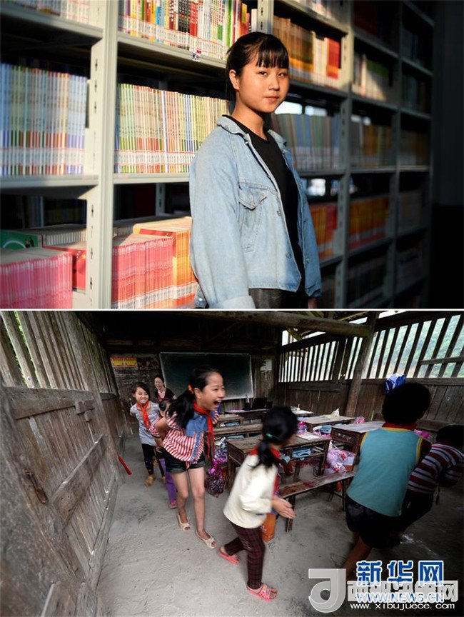 這是一張拼版圖片。上圖為2018年5月30日,在廣西三江侗族自治縣洋溪鄉(xiāng)中學(xué),14歲的吳瑩瑩在圖書館里留影;下圖為2014年6月10日,吳瑩瑩(前三)和同學(xué)們在吊腳樓教室里做游戲。