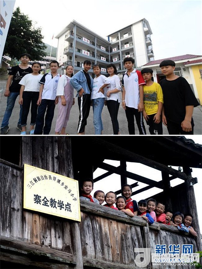 這是一張拼版圖片。上圖為2018年5月30日,在廣西三江侗族自治縣洋溪鄉(xiāng)中學(xué),已經(jīng)進入初一就讀的孩子們在校園里合影;下圖為2014年5月26日,孩子們在寨全教學(xué)點的吊腳樓教室上留影。