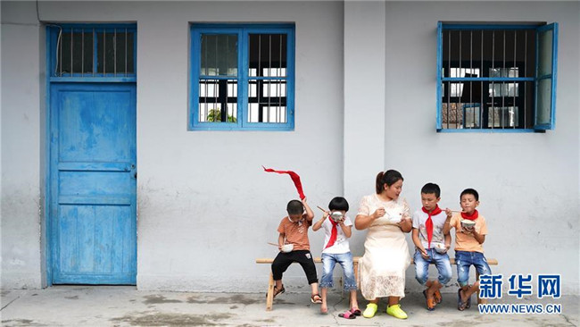 9月4日,陳春英和幾名學(xué)生坐在教室外吃午飯。新華社記者胡晨歡 攝